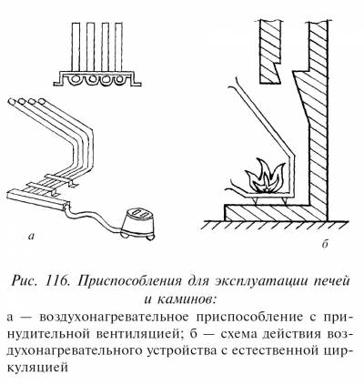 Устройство тепловых камер Для того чтобы повысить КПД камина, в его корпусе делают тепловые камеры, которые служат для нагревания воздуха от стенок топливника. Комнатный воздух, циркулируя между внешними стенками топки и внутренними стенками камина, осуществляет дополнительную отдачу тепла в помещение. Тепловую камеру можно сделать из отрезка трубы и установить в самом топливнике. В продаже имеются готовые каминные вставки в виде тепловых кассет. Тепловые кассеты могут иметь двойные стенки или состоять из двух элементов: тепловой вставки и конвекционной камеры. Тепловая вставка имеет внутри колосниковую решетку, а под ней — зольниковую камеру в виде выдвижного ящика. Сверху имеется регулятор тяги. Тепловые кассеты оборудованы стеклянными дверцами, которые уменьшают приток воздуха к горящему топливу. Конвекционная камера сверху имеет щелевидные отверстия, через которые нагретый воздух попадает в помещение. Можно направить теплый воздух в соседнее помещение через решетку в задней стенке тепловой кассеты, если камин расположен у внутренней стены дома. Чтобы вставить тепловую кассету в готовый камин, нужно очистить топку и трубу от сажи. Тепловая кассета должна быть соразмерна топливнику. Сначала в камин вставляют конвекционную камеру. В отверстие между полом и камерой закладывают уплотнительный шнур для герметизации и замазывают шамотным раствором. Пространство между стенками камеры и внутренними стенками топки заполняют огнеупорным раствором через отверстие, сделанное в облицовке камина над карнизом. В крыше конвекционной камеры предусмотрено отверстие для трубы, в которое вставляют металлическую трубу подходящего диаметра, верхний конец которой соединяется с дымоходом. Затем герметизируют щель вокруг места соединения трубы с кон векционной камерой глиняным раствором, а отверстие в облицовке заделывают. Затем с тепловой вставки снимают колосниковую решетку, зольник и дверцы и вдвигают ее в конвекционную камеру. Крепят тепловую вставку к внешней конвекционной камере соединительными винтами сверху и снизу. После того как тепловая камера установлена, в нее вставляют зольник, колосник и прикрепляют дверцы. При помощи зажимов с двух сторон конвекционной камеры ставят металлическую рамку для облицовки тепловой кассеты. В магазине можно приобрести для повышения КПД нужные детали, которые могут повысить теплоотдачу камина. Это может быть специальная вставка из труб, засасывающая внизу воздух из помещения (рис.116).