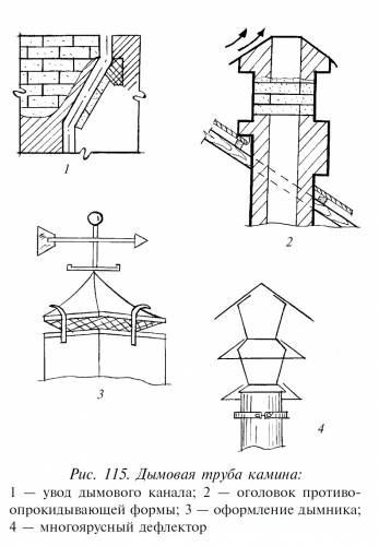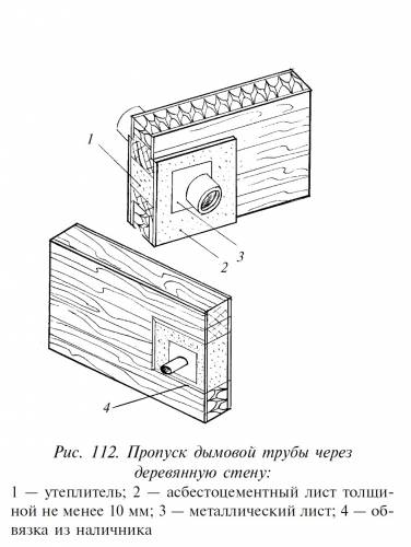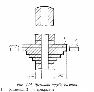Монтаж и облицовка дымовых труб Дымоходная труба должна располагаться строго вертикально, ее внутренняя поверхность должна быть ровная, без уступов. Если делается увод, то он не должен уходить в сторону более чем на метр и под углом не менее 60° к горизонту. При прокладке трубы необходимо учитывать отсутствие на ее пути препятствий. Если дом двухэтажный (с мансардой), и на каждом этаже расположена печь, плита или камин, то необходимо помнить о том, что каждый очаг должен иметь самостоятельный дымоход, так как при одновременной топке нижний дымоход будет перебивать дымоход верхнего и последний будет дымить. Дымоход от двух очагов возможно выводить в один канал, если они расположены на одном этаже. Для этого делают рассечку в канале в 1/2 кирпича на высоту не менее 75 мм или два вертикальных патрубка (длиной не менее 1 м) сводят в один общий канал. Общий канал при этом необходимо увеличить до размера 14 х 27 см. Высота дымохода камина должна быть больше, чем у печи, потому что при горении у камина расходуется большое количество воздуха. Для уменьшения потерь тепла стенки дымохода должны быть достаточной толщины: у холодной наружной стены — в кирпич, в середине помещения — в полкирпича. При наличии деревянных стен пропуск дымовой трубы через нее должен осуществляться через асбестоцементный или металлический лист (рис. 112). Лучшей формой сечения дымовой трубы является круглая- квадратная и прямоугольная формы хуже, так как в прямых углах при скоплении сажи затрудняется движение газов. Оптимальное поперечное сечение дымовой трубы — 1/10, 1/12 или 1/15 от размера топочного отверстия. Для устройства дымоходов лучше использовать асбоцементные или керамические трубы. Существуют готовые комплекты дымовых труб, включающие в себя стандартные блоки, воротниковые плиты для облицовки, защиту для верха и некоторые другие элементы. Монтаж такой трубы начинается с установки первого блока на верх дымосборника. Цементный раствор наносится на место соединения трубы с дымосборником, блок ставят на место так, чтобы отверстия трубы и дымосборника совпали, и выравнивают. Пазы блока должны быть обращены вверх. Внутрь вставляют первый блок футеровки расширенной частью сверху с равномерным зазором со стенками внешнего блока. Затем на края внутреннего блока наносят слой раствора и устанавливают на него второй внутренний блок. При установке нужно внимательно следить за качеством швов. После этого устанавливают второй наружный блок трубы аналогичным образом. Установкой последующих блоков трубу доводят до потолка. Можно закрепить трубу при помощи анкерных соединений со стеной здания. Анкеры ставят через каждые 3–4 блока. Между внешней стенкой трубы и сгораемым материалом должно соблюдаться расстояние не менее 38 мм. При прохождении трубы потолочного перекрытия делают зазор 38 мм, который закрывают несгораемыми материалами. Воротниковую плиту устанавливают на 35 см ниже стропил на верхний блок трубы при помощи раствора толщиной 15 мм. Воротниковую плиту кладут на раствор и выравнивают до горизонтального положения. На плиту накладывают раствор и устанавливают облицовочные блоки трубы до необходимой высоты, вставляя в каждый шов металлические связи. Выше воротниковой плиты трубу облицовывают кирпичами на цементном растворе, состоящем из 1 части цемента и 4 ч