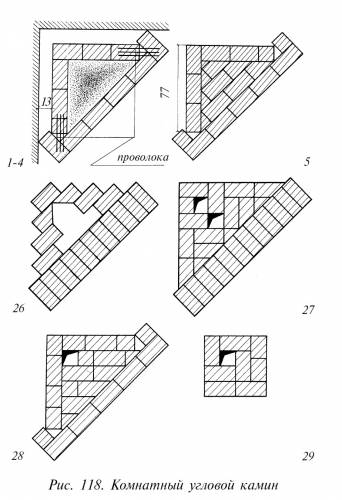 Комнатный угловой камин Этот камин предназначен для установки в углу помещения не столько для отапливания, сколько для создания уютной обстановки в доме. Камин с односторонним излучением тепла. Устроен он очень просто. Для кладки потребуется: кирпич обыкновенный — 340 штук, глина — 0,2 м3, песок — 0,3 м3, предтопочный лист 60 x 80 см — 1 штука, каминная решетка с рамкой 25 x 40 см или 38 x 42 см — 1 штука, дымовая задвижка — 1 штука, проволока сечением 3 и 5 мм, проволока отожженная сечением 1 мм ( рис. 118). До четвертого ряда включительно выкладывается трехстенная коробка, которая затем заполняется песком. Передние углы камина армируют проволокой сечением 3 мм. Ее за кладывают в швы по три прутика через ряд кладки. На пятом ряду выкладывается под. Кладка ведется насухо. Пустоты заполняются глиняным раствором и кирпичным щебнем. На шестом ряду устанавливается решетка с рамкой. Ширина полосы для рамки — 8 см. Кирпичи этого ряда образуют порог, предохраняющий от выпадения углей из топки. Можно не ставить решетку, оставив открытый проем. В таком случае его перекрывают металлической полосой длиной 60–70 см, шириной в полкирпича, толщиной 5 мм. На 26-м ряду начинают кладку карниза. Для этого поверхность 25-го ряда выравнивают раствором. 23 кирпича укладывают торцевыми частями наружу с напуском в 5 см вперед. Крайние кирпичи кладут с таким же напуском в стороны. Торцевые грани кирпичей должны быть одинаковыми по высоте. Дымоход сужают, как показано на рисунке. 27-й ряд укладывают таким же образом с выравниванием ряда глиняным раствором и напуском кирпичей наружу в 5 см. В последнюю очередь кладут крайние кирпичи. Дымоход продолжают сужать до образования двух отверстий сечением в полкирпича. На 28-м ряду все кирпичи карниза перекрывают на 3–4 см. Перекрывают одно отверстие дымохода. С 29-го ряда начинают кладку дымовой трубы. На третьем ряду дымовой трубы устанавливают дымовую задвижку.