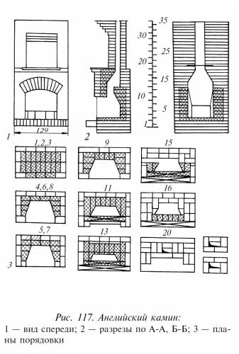 Английский камин Английский камин представляет собой апробированную временем конструкцию камина с прямым дымоходом. Он относится к разновидности каминов с односторонним излучением. Конструкция английского камина довольно проста (рис. 117). Размер камина в плане 77 x 129 см. Этот камин предназначен для обогревания небольших помещений площадью 20–25 м2. Для кладки потребуется: кирпич обыкновенный — 720 штук, в том числе огнеупорный — 185 штук, дымовая задвижка 14 x 27 см, прочистная дверка — 1 штука. Сечение топливника имеет форму трапеции, поэтому боковые стенки при нагревании излучают тепло в помещение. Задняя стенка топливника до высоты 38 см устроена вертикально, затем наклоняется под углом 20° в сторону помещения. Тепло, отразившись от наклонной стенки, направляется к полу. Выше располагается дымосборник в форме пирамиды. Пирамидальная форма дымосборника и дымовой зуб служат для предотвращения дымления камина. Сбоку от дымового зуба устраивают прочистное отверстие для чистки дымохода. Дымовую задвижку устанавливают на конце дымового зуба, если применяют поворотный шибер, или в дымоходе, если используется обычная печная задвижка. Для сжигания дров можно использовать металлическую корзину или колосниковую решетку, что улучшает процесс горения. В таком случае устраивают зольниковую камеру. Можно сжигать дрова на поду топливника. Для увеличения КПД камина можно устроить тепловую камеру в корпусе камина. Пол вокруг портала выкладывают огнеупорным кирпичом, спереди — на 50 см, по бокам — на 30 см.