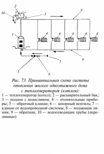 Вы можете подключить свой дом и надворные постройки к близлежащей системецентрального отопления или сделать печноеотопление — это ваш выбор.Локальное теплоснабжение может быть иот котла (водяное), от электро или газонагревателей.Водяная система отопления имеет, как правило, естественную циркуляцию. Прокладкагорячей разводящей линии наиболее частоприменяется под потолком помещения, а обратной линии — у пола, под отопительнымиприборами. Котел (теплогенератор) устанавливается стандартный, как и вся арматура.Расширительный бак служит емкостьюдля увеличивающегося объема воды при еенагревании, устанавливается на высоте (в жилых домах на чердаке) и утепляется.Необходимы отопительные приборы — чугунные или стальные штампованные радиаторы. Их характеристика зависит от площади нагреваемой поверхности, рассчитываемойдля обеспечения требуемой отдачи прибора.Радиаторы выпускаются цельные (панельные) или в виде секций:— стальные панельные типа РСТ1— стальные панельные типа РСВ— чугунные секционные типа МС140,МС90.Более компактными являются стальныепанельные радиаторы, имеющие меньшийвес, у них более низкая тепловая инерция.Поэтому их часто устанавливают в 2–3 ряда.Радиаторы чугунные высотой 50 см состоят из стальных чугунных секций, собираемыхна ниппелях с применением прокладок, обеспечивающих герметичность соединения.Котлы (теплогенераторы) для системотопления и горячего водоснабжения в индивидуальных домах выпускаются следующих серий: АОЖВ, АКЖ232, котел «Атрама», КГМ3Д2М, КГМ2М, АОГВ и др.— нагазовом, твердом или жидком топливе. Имеются и электрические теплогенераторы. Систему теплоснабжения следует прокладывать в соответствии с проектом. Так как ксистеме предъявляются особые требованияпо эксплуатации и ремонту, для нее необходимо приспособить дом и надворные постройки, предусмотреть соответствующиеконструкции.На рис. 73 показана в качестве примера принципиальная схема водяного отопления.Можно устроить двухтрубную системуводяного отопления (без использования радиаторов) с естественной циркуляцией воды, состоящую из двух линий: верхней горячей и обратной. Такая схема устройствапоказана на рис. 74.От котла или печи вверх поднимаем основной стояк и врезаем его в расширительный бачок, расположенный на максимальновозможной высоте. Из нижней половины боковой грани расширительного бачка выводим трубу горячей линии и опускаем ее доуровня развязки (чаще всего горячая линиярасполагается на уровне начала окон).Проведя верхнюю линию по всем помещениям, опускаем трубу до пола, тем самымпревратив ее в обратную линию. Обратнуюлинию проводят на уровне пола до котла илипечи по тому же пути, что и горячую, располагая их параллельно друг другу. Врезав трубу обратной линии в водонагревательный элемент котла или печи, вы тем самым замыкаете систему водяного отопления.На самой нижней точке (в конце обратной линии) в систему врезаем патрубок скраном для слива воды в канализацию, свободный конец патрубка можно вмонтировать в канализационную систему. Расширительный бачок может быть сделан изпростой или нержавеющей стали с открытым отверстием на верхней грани. Его оптимальный объем для стандартного дома,состоящего из кухни, санузла, душевой иливанной и двухтрех комнат, — 20–25 л, однако заполнять его следует не более чем на3/4, 